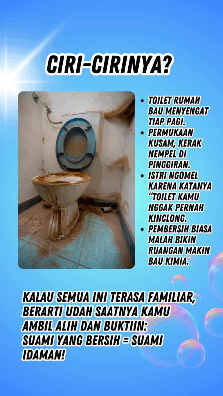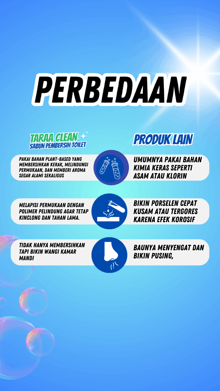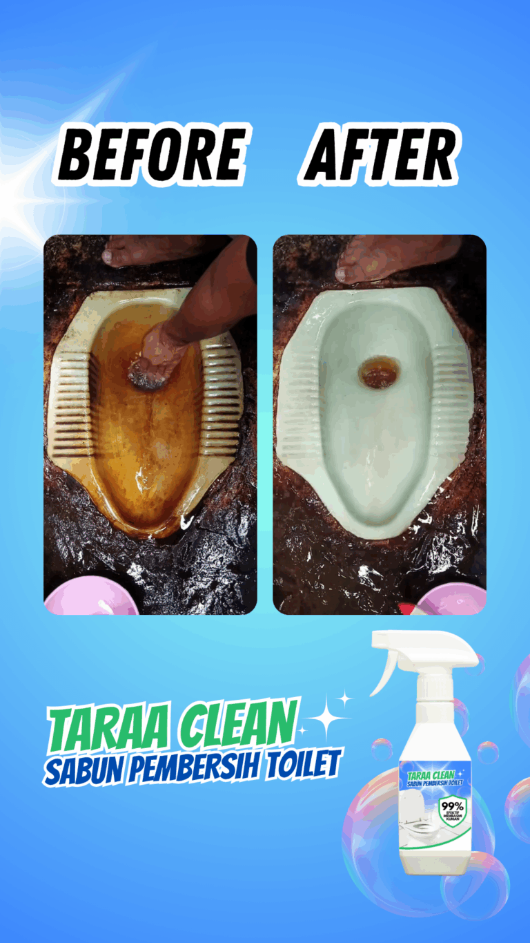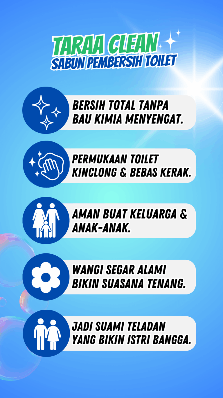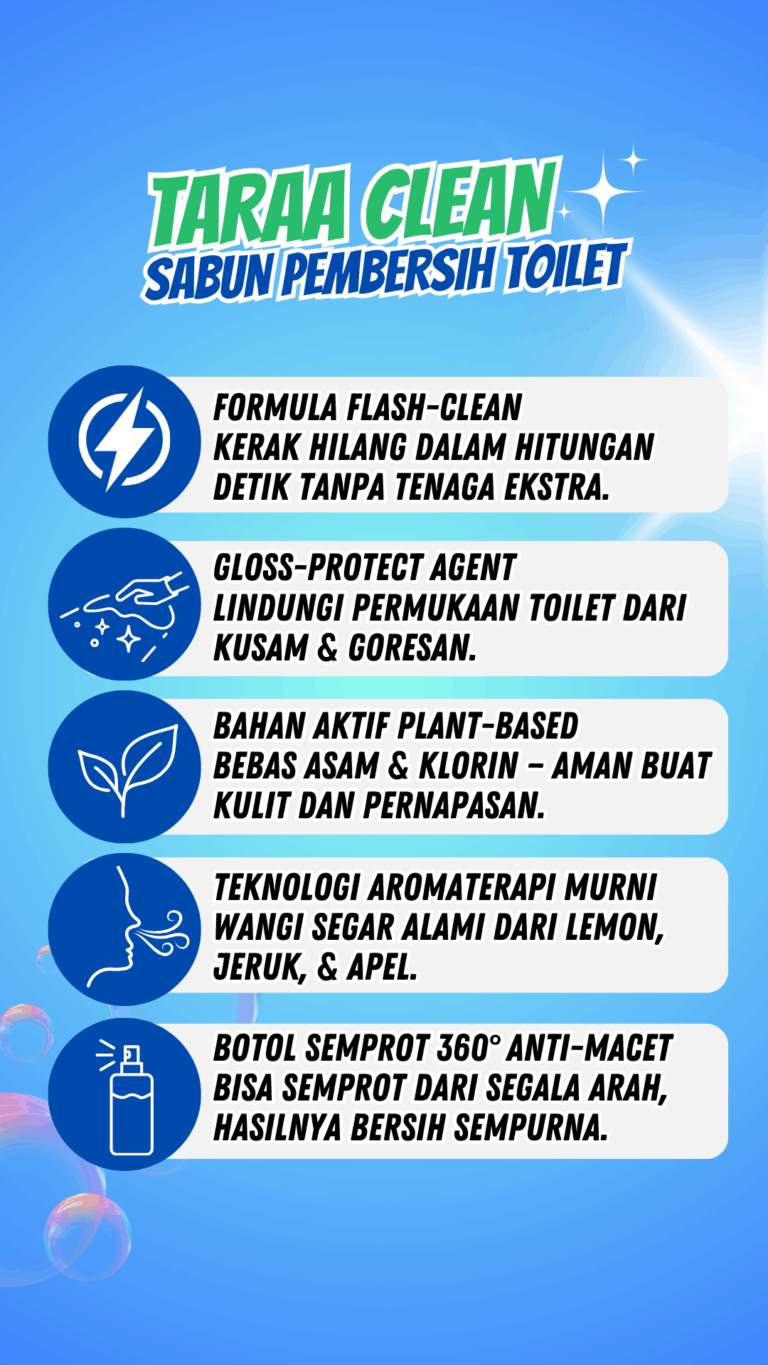 Dengan TARAA Clean, cukup semprot dan usap 5 menit aja, toilet langsung cling kinclong!