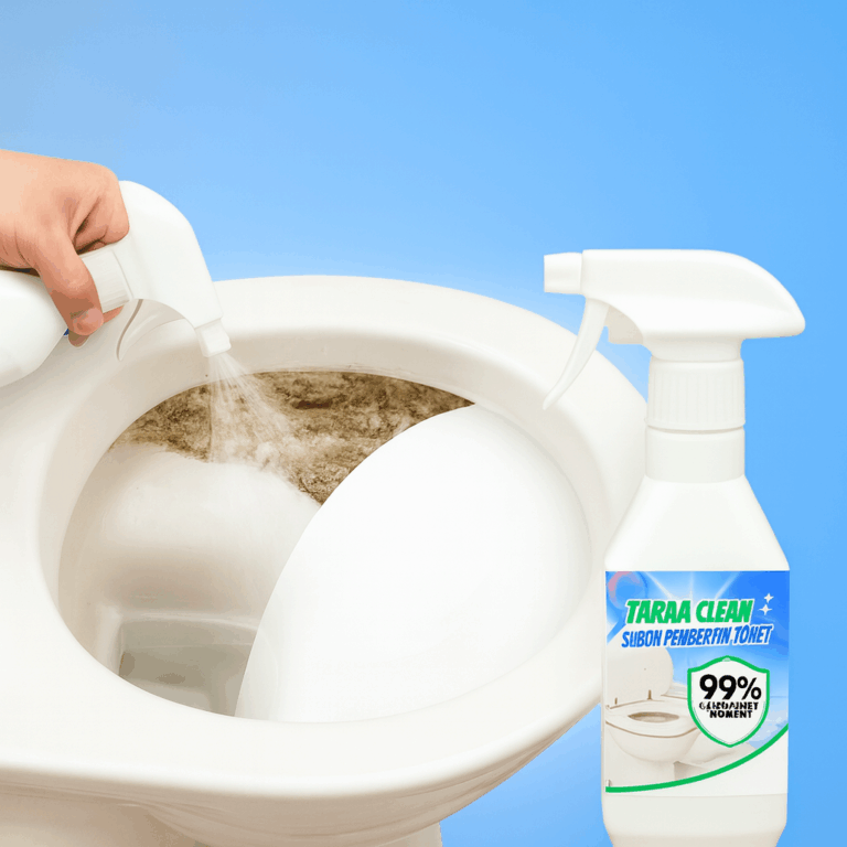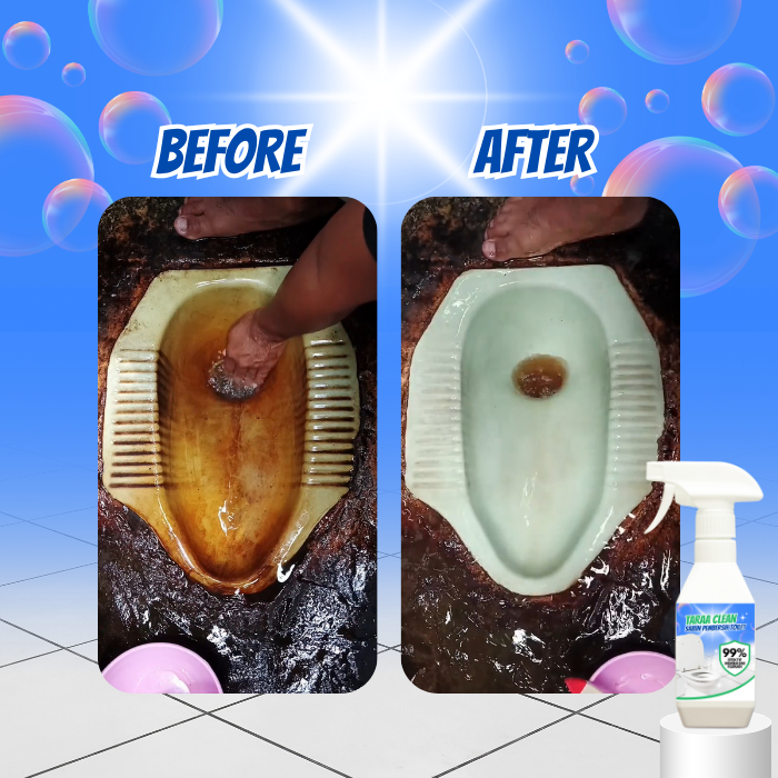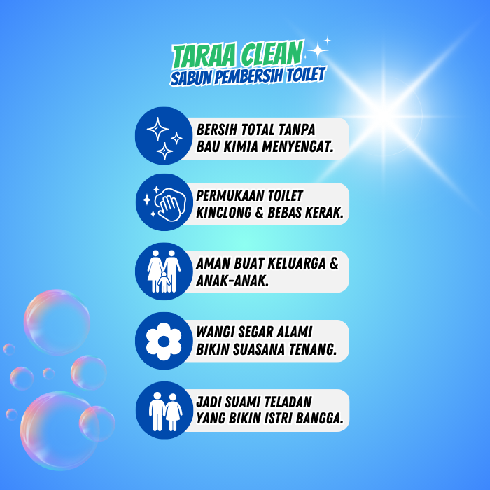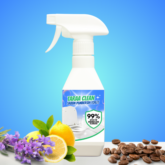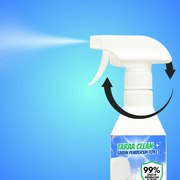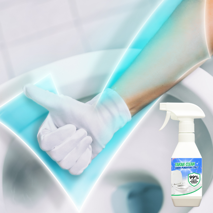 Dengan TARAA Clean, cukup semprot dan usap 5 menit aja, toilet langsung cling kinclong!